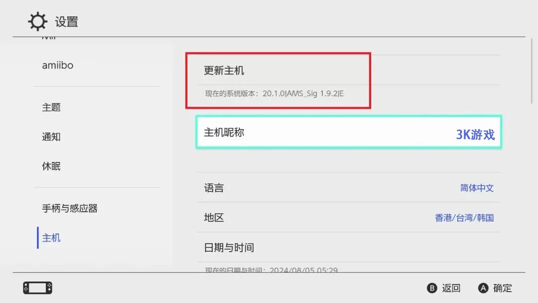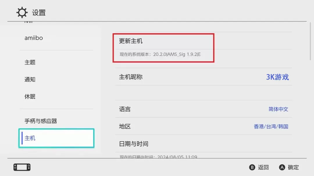10.重启后,打开【设置-主机】确认大气层版本以及固件版本成功升级。
