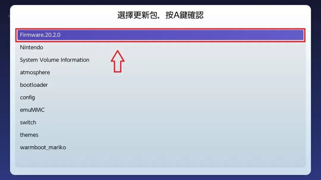 6.选中最新固件选项【20.3.0】,按 A 确定